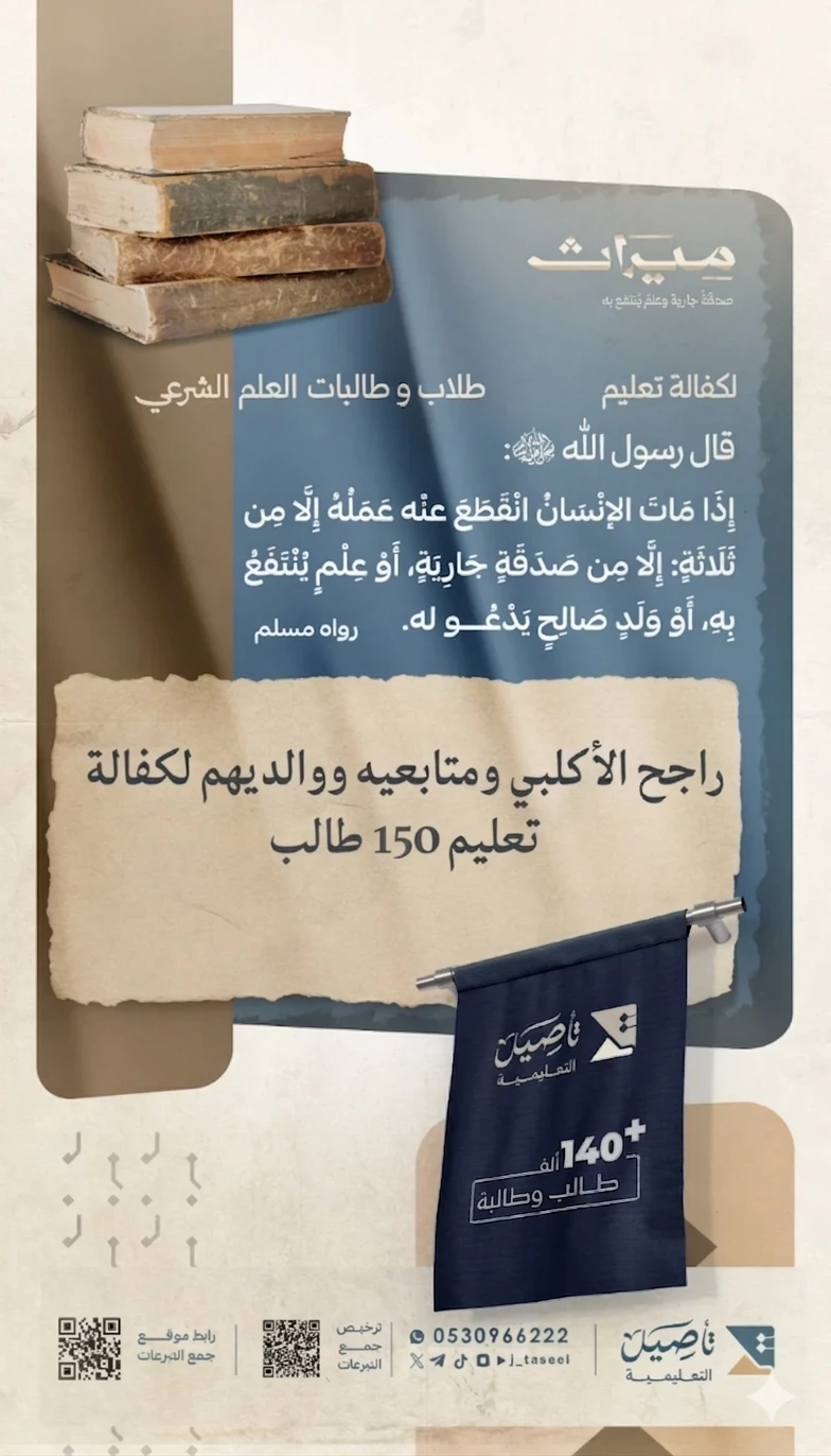 ساهم في كفالة تعليم طلاب وطالبات العلم الشرعي، ليكون لك ولمتابعيك أثر باقٍ وصدقة جارية تستمر بفضل الله. 🌾♻️