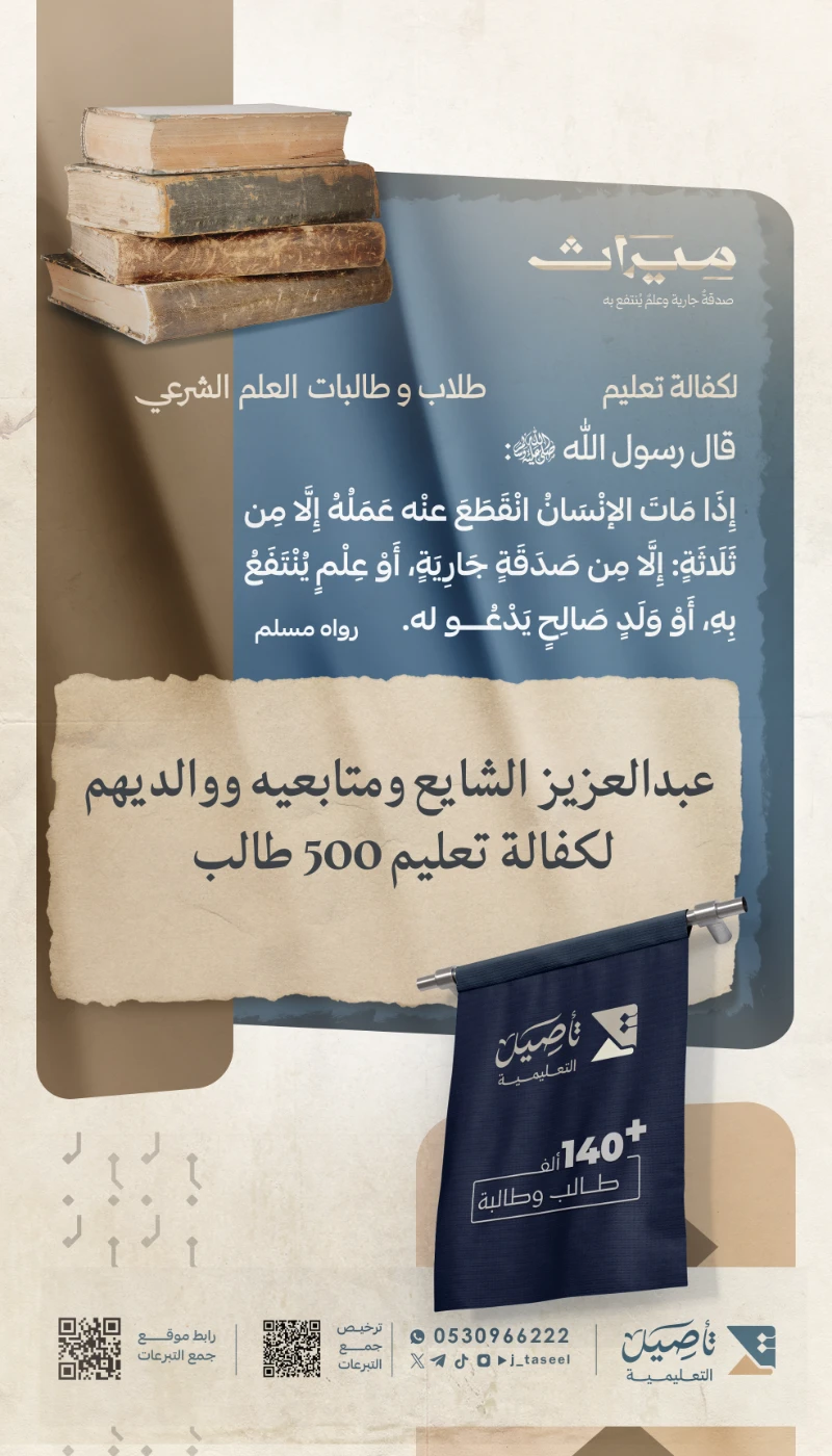 ساهم في كفالة تعليم طلاب وطالبات العلم الشرعي، ليكون لك ولمتابعيك أثر باقٍ وصدقة جارية تستمر بفضل الله. 🌾♻️